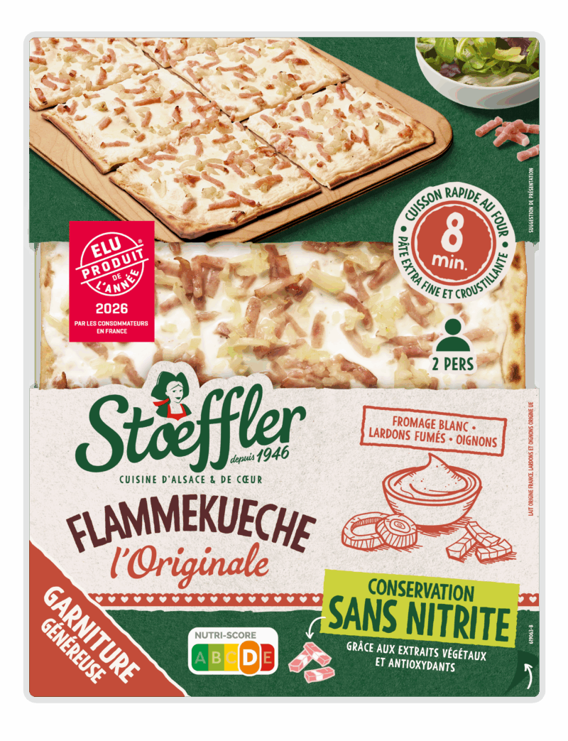 Une pâte préparée avec de la farine d’origine 100% française et confectionnée chaque jour dans notre atelier par nos boulangers de métier. Étalée très finement, elle est garnie d’oignons et de lardons à conservation sans nitrite fabriqués par nos propres bouchers-charcutiers et d’un mélange gourmand de fromage blanc et de crème élaborés avec du lait français.