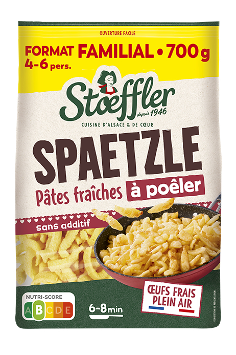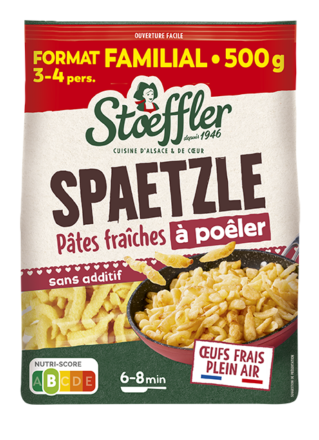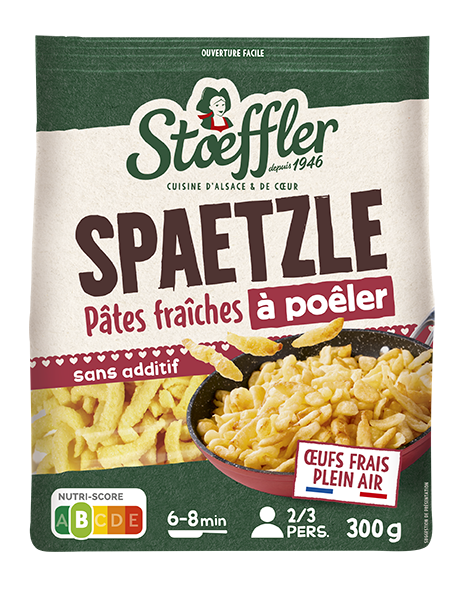 Découvrez les Spaetzle, une spécialité culinaire alsacienne ressemblant à des petites pâtes, moelleux dedans et croustillants dehors ! Stoeffler propose une recette gourmande et de qualité, composée d’œufs frais de poules élevées en plein air, ce qui garantit le moelleux et le goût typique de nos Spaetzle. Rapide à préparer en 6 minutes à la poêle pour un résultat croustillant ou directement au micro-ondes pour un résultat plus moelleux. Les Spaetzle se dégustent d’une multitude de façons. Seuls, agrémentés de fromage râpé ou en accompagnement de vos plats de viandes ou poissons en sauce.