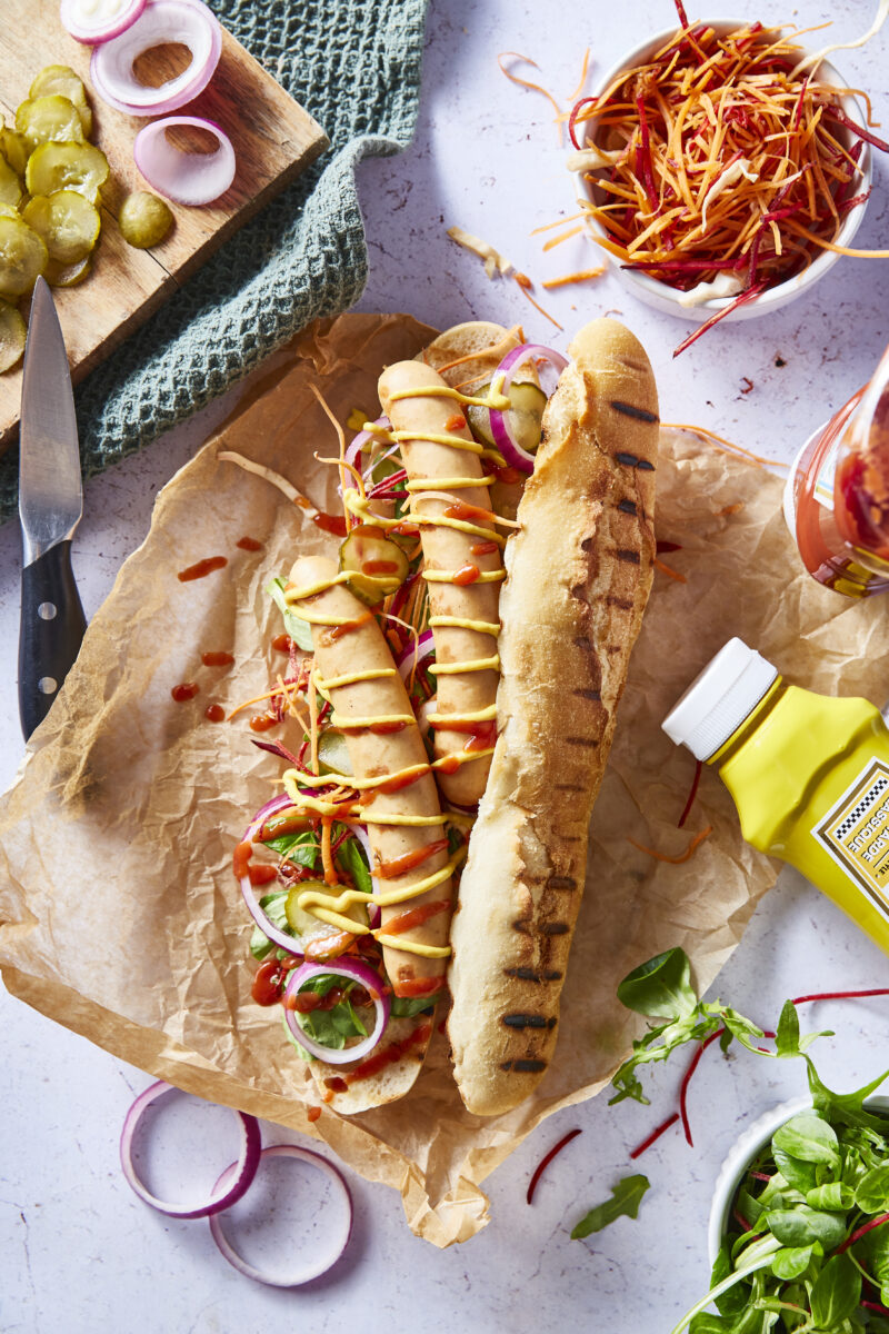 Déposez une ou deux knacks chaudes dans chaque pain, puis ajoutez un peu de carotte et de betterave râpées, de salade verte, d’oignon rouge et quelques rondelles de cornichons.